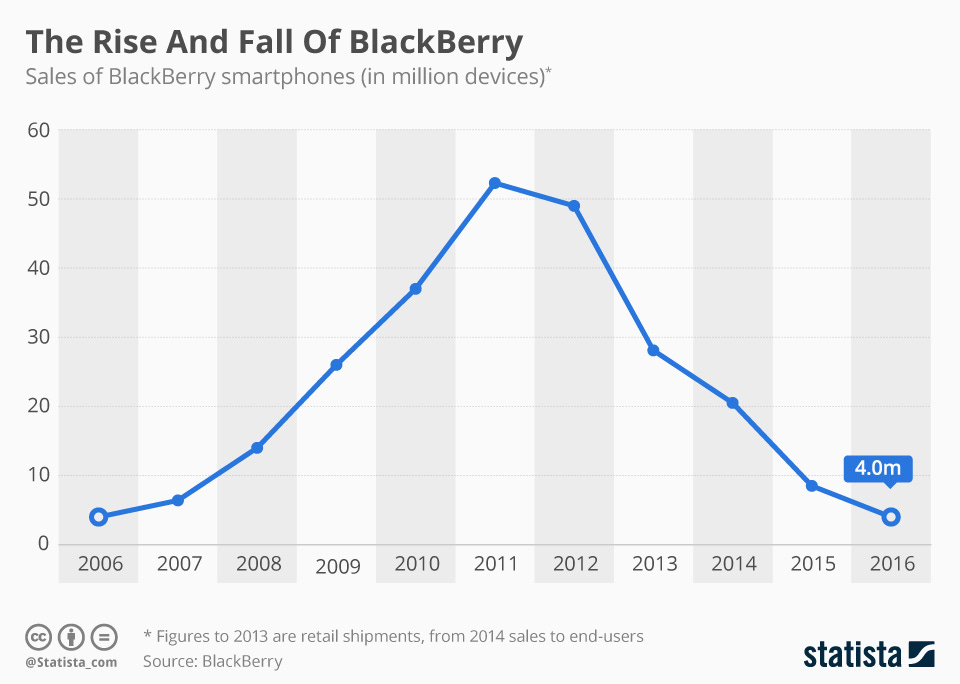 BlackBerry is a clean example. In retrospect, its collapse looks inevitable after the iPhone. But historically, BlackBerry actually grew for years after the iPhone (2008) and App Store (2009). It peaked around 2011—roughly 4x larger than it was in 2008.
