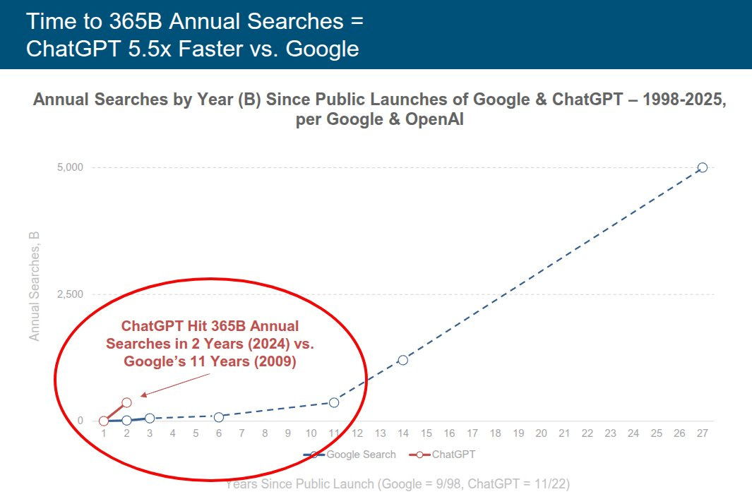 By 2025, estimates suggest that ChatGPT-driven query volume has reached ~10% of Google’s search query volume, and the “starting point” for information discovery is rapidly moving from Google to ChatGPT. Google took more than a decade to reach its current scale; ChatGPT reached comparable behavioral gravity in roughly two years.